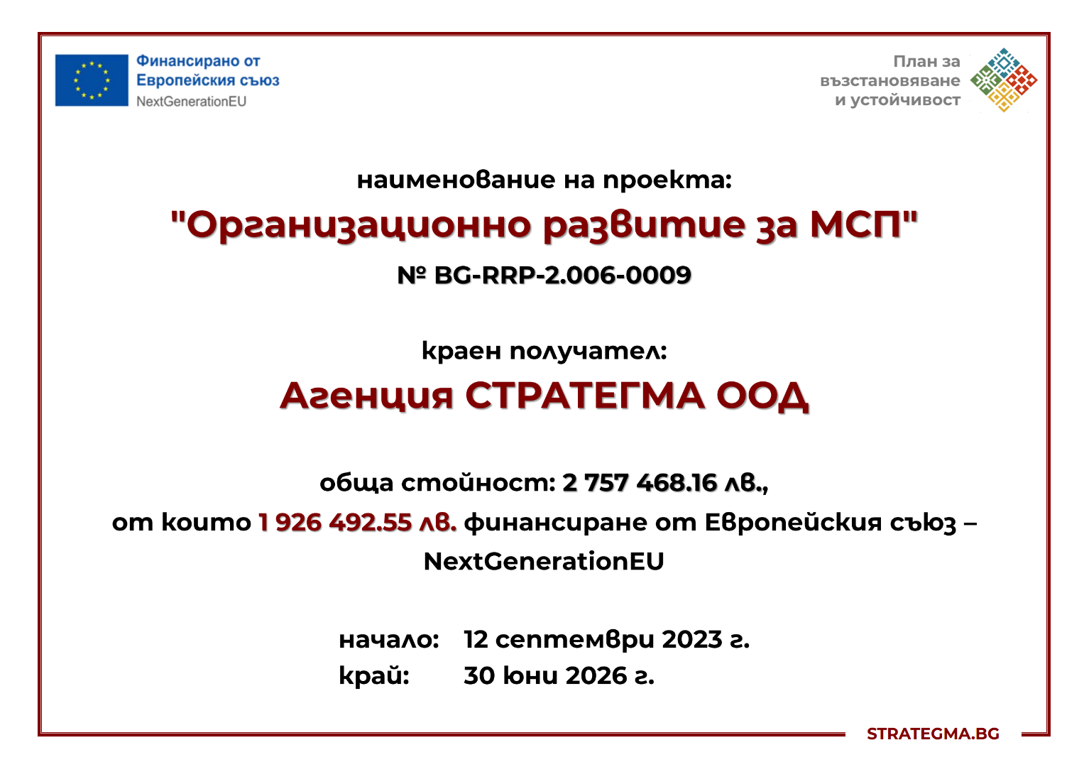 The total cost of the project is BGN 2,757,468.16, of which the amount of grant funding from the National Development Plan is BGN 1,926,492.55. The implementation period is 34 months, starting from September 2023. STRATEGMA's contribution to the implementation in the amount of BGN 830,000 is provided with its own funds.
